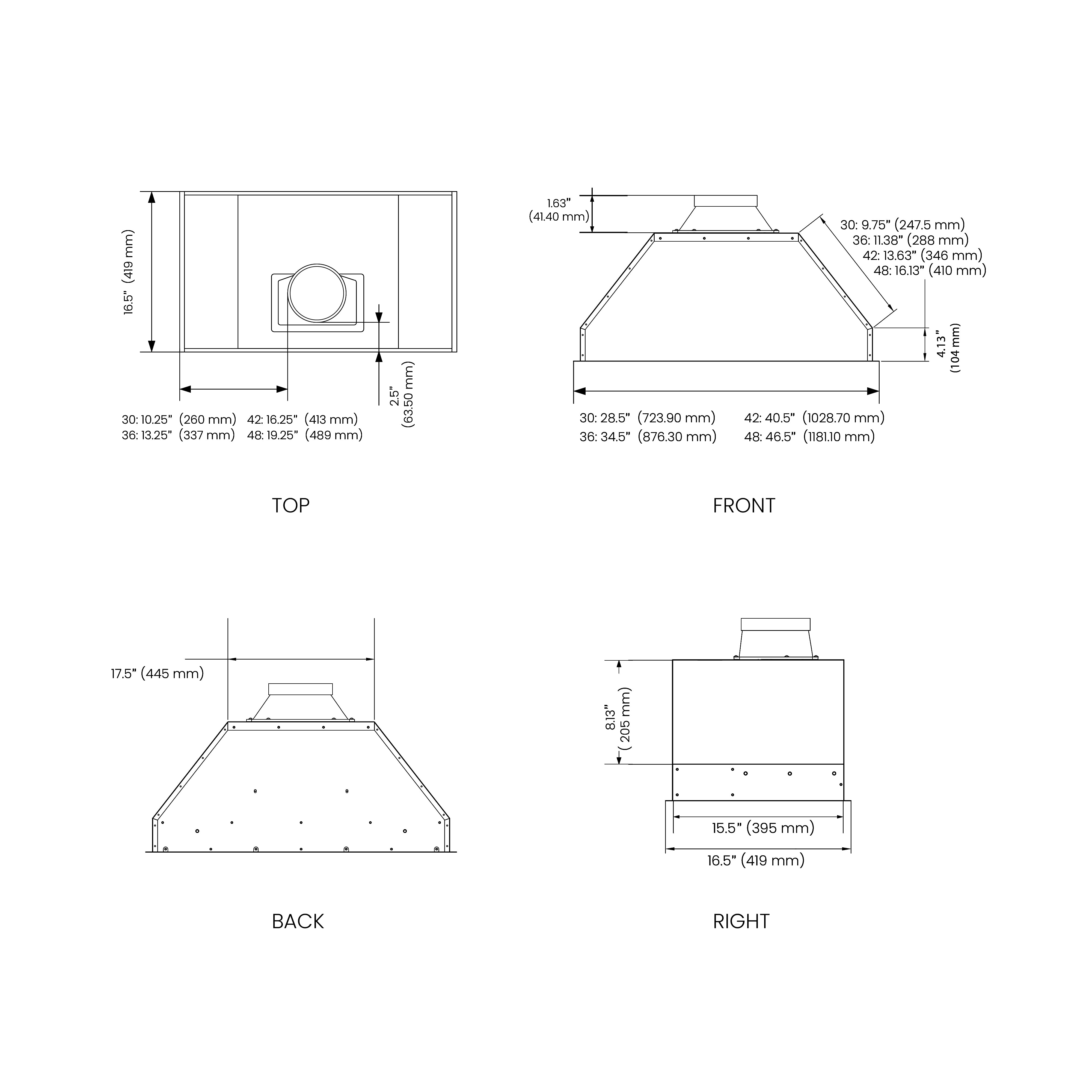 - 8" Round Vent: The top vent connector is an 8" diameter round shape, providing a larger tunnel for the range hood's colossal 1000cfm performance.