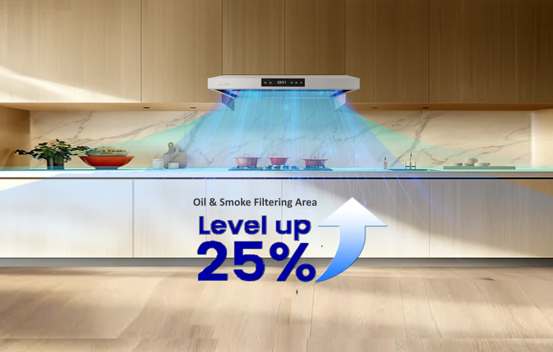 Vesta’s most upgraded baffle filters’ size has increased by 25%, allowing more airflow to be smoothly circulated. Capturing oil and dust, the filters effectively keep the debris away from the motors, ensure that the range hood operates efficiently for longer, and reduces the frequency of cleaning and maintenance.