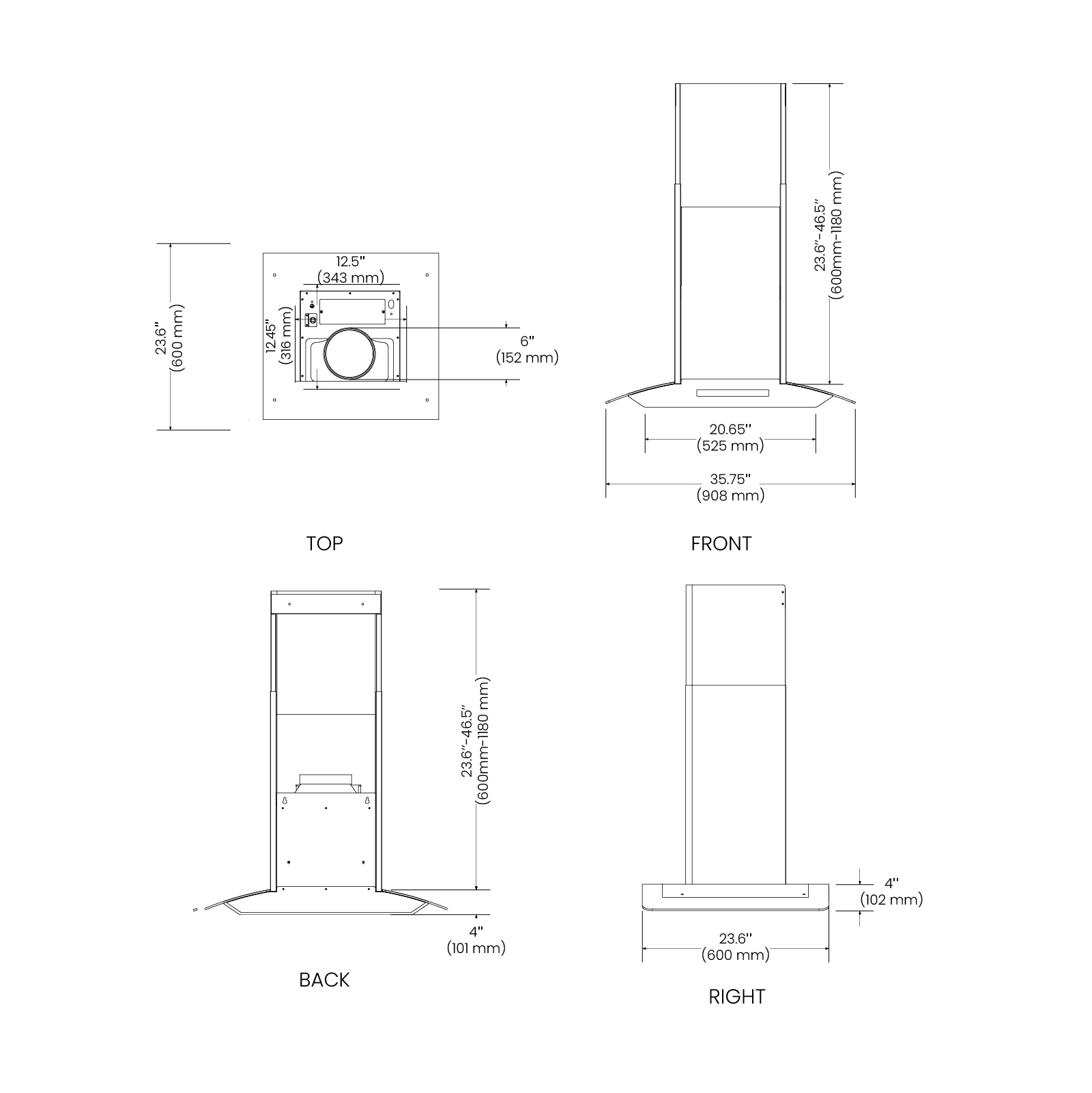 Hood Dimensions (W×D×H) | 35.75" × 23.6"× (27.6" - 50.5") |